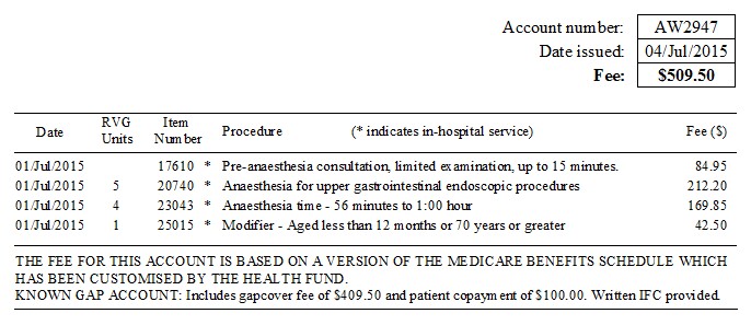From version 7.8, when printing an account to send to a health fund that includes a copayment, by default, accounts will print the itemised KNOWN gap amounts for each item. Additionally, the total KNOWN gap amount will appear as the account total. A separate note will state that the account is a Known Gap Account and will give the total fund and copayment amounts, as shown below.