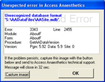 | • | You are trying to open a database which is formatted in a more recent version of Access to the version you are using. For example, you are using Access 97 but trying to open an Access 2000 database. This may happen to satellite clients using Access 97 when the practice uses Access 2000 or above. It could also happen on a network system if the 97 runtime is installed on a PC when the data files are in 2000 format. You need to identify the version of Access you are using (Help > About Access Anaesthetics) and the source of the files you are trying to open. For more details, see Problems with Microsoft Access Versions. |